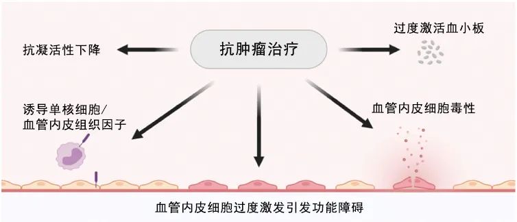其中,化療和分子靶向藥物等藥物治療會(huì)通過降低抗凝活性,誘發(fā)單核細(xì)胞和血管內(nèi)皮細(xì)胞的組織因子,過度激活血管內(nèi)皮細(xì)胞而發(fā)生功能障礙,產(chǎn)生血管內(nèi)皮細(xì)胞毒性,引起血小板過度激活等方式促進(jìn)血栓形成(如圖)。