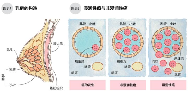 小葉和乳管細(xì)胞異常病變增殖后乳腺癌就發(fā)生了。癌細(xì)胞局限于小葉或乳管上皮細(xì)胞內(nèi)的為“非浸潤性癌”,癌細(xì)胞擴(kuò)散到小葉或乳管外的為“浸潤性癌”(圖2)。非浸潤性癌不威脅生命,浸潤性癌的微小癌細(xì)胞可能擴(kuò)散到身體其他部位,需進(jìn)行全身治療。
