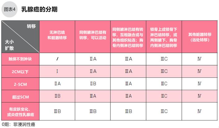 分期(Stage)是了解患者病情、預(yù)后和選擇治療方法的重要指標(biāo)。根據(jù)腫瘤大小、周圍淋巴結(jié)和臟器轉(zhuǎn)移情況,將乳腺癌分為0、Ⅰ、ⅡA、ⅡB、ⅢA、ⅢB、ⅢC、Ⅳ期的8個階段。0期是非浸潤性癌,Ⅰ期以后是浸潤性癌,越靠近Ⅳ期就越接近晚期(圖4)。