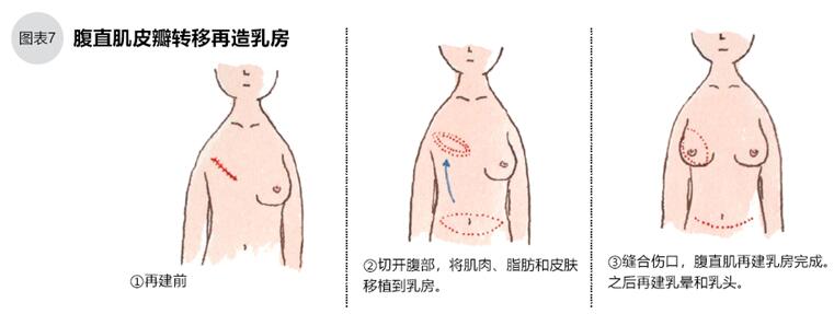 乳房再建術(shù)的填充材料,可使用自體組織,也可使用人工乳房。用自體組織的有三種移植方法:“皮瓣再建術(shù)”移植腹部肌肉、脂肪和皮膚(圖7);“穿通支皮瓣再建術(shù)”移植腹部、臀部富含血管的脂肪、皮膚組織;“背肌皮瓣再建術(shù)”移植背部肌肉等。其中傳統(tǒng)支皮瓣再建術(shù)不移植肌肉組織,患者傷痛較小,但是這個手術(shù)非常難,只有極個別醫(yī)院可以完成。