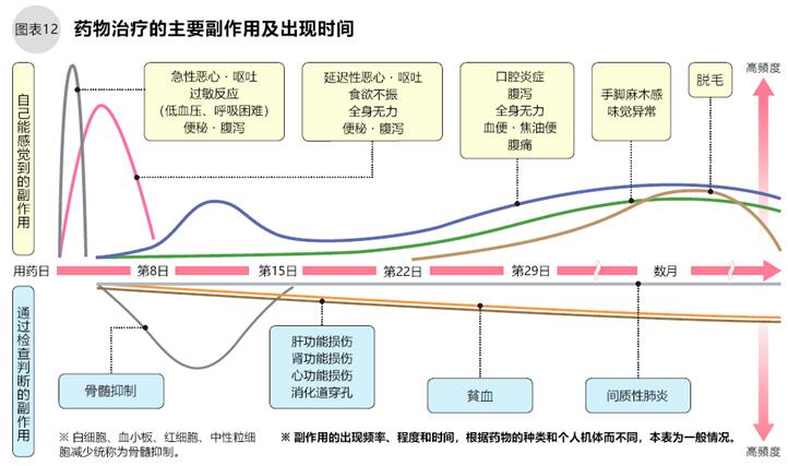 藥物治療的副作用及其癥狀因藥物種類和個體差異而不同。針對惡心、嘔吐,現(xiàn)在已經(jīng)開發(fā)出了很多藥物,可有效控制副作用。請在化療前掌握副作用的相關(guān)信息,有助于患者冷靜的接受治療(圖12~16)。