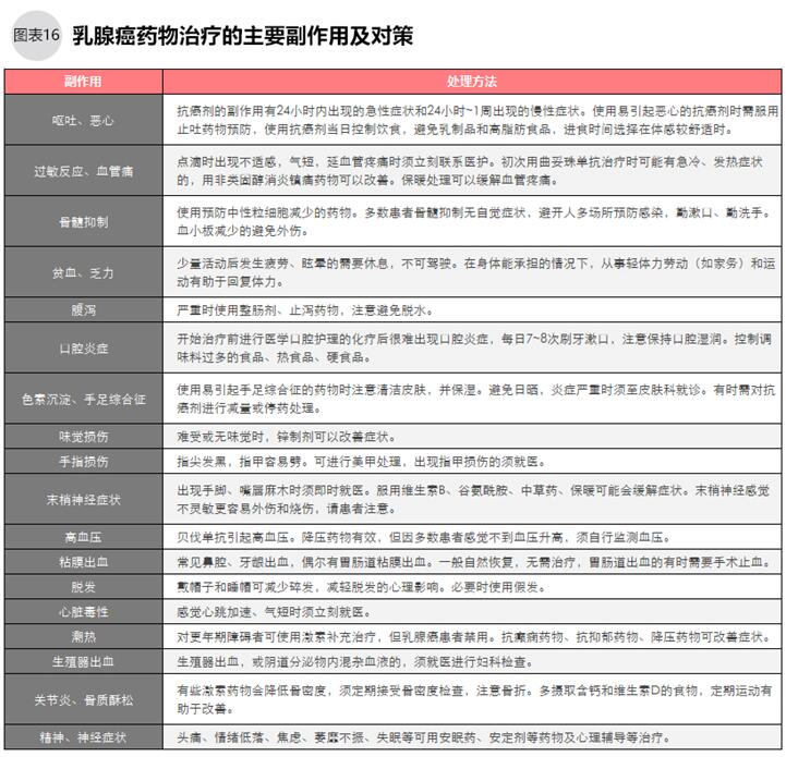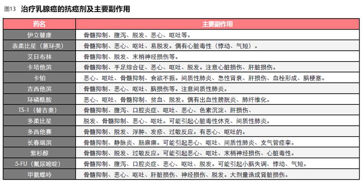 副作用分為可自行處理的與需就醫(yī)處理的,有自覺癥狀和初期無癥狀但在醫(yī)療機(jī)構(gòu)檢查后診斷出的。多數(shù)用于乳腺癌治療的抗癌劑副作用是骨髓抑制(血小板、白細(xì)胞、紅細(xì)胞、中性粒細(xì)胞減少)。表柔比星、環(huán)磷酰胺、多柔比星等易引起強(qiáng)烈的惡心、嘔吐,在這些藥物點滴的同時加入止吐藥物,口服血清素抗體抗結(jié)劑和類固醇藥物可緩解癥狀。