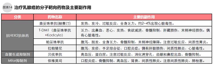 分子靶向藥物的副作用沒有抗癌劑引起的骨髓抑制、脫發(fā)等那么嚴(yán)重,抗HER2抗體藥物曲妥珠單抗、帕妥珠單抗、TMD-1等偶爾發(fā)生心臟毒性(心功能損傷、心衰),出現(xiàn)這些副作用時應(yīng)停止用藥。貝伐單抗可能引起高血壓、蛋白尿、鼻齒出血、骨髓抑制。