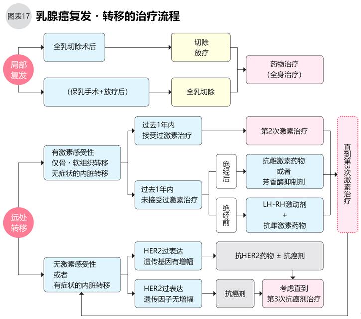 有激素感受性的人復(fù)發(fā)轉(zhuǎn)移后,原則上使用抗雌激素藥物、LH-RH抗結(jié)劑、芳香酶抑制劑等單藥或聯(lián)合治療。有激素感受性并HER2陽性的,除了激素治療,也可以用抗HER2藥物和激素治療配合,或者激素治療+抗HER2藥+抗癌劑治療(圖17)。