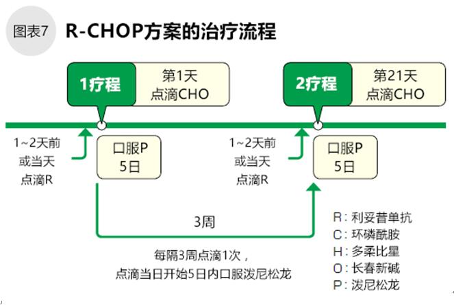 R-CHOP方案只追加利妥昔單抗,在CHOP方案開始前1~2天或者當天點滴1次(圖表7),其他與CHOP方案一樣。