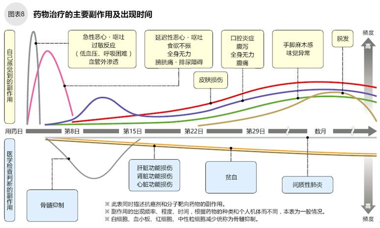 化療時或化療結束后數周容易出現過敏反應、血管外滲透、惡心嘔吐等癥狀;化療后3日~2周容易出現骨髓抑制、口腔炎癥、乏力等癥狀;化療后2周開始可能出現脫發、末梢神經損傷等的癥狀。