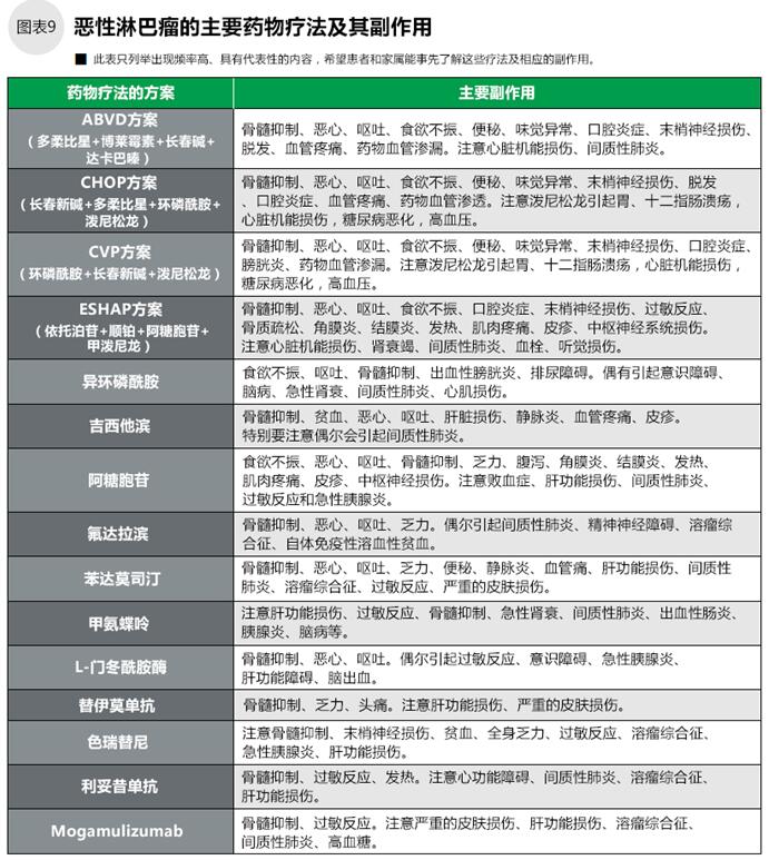 骨髓抑制、嘔吐惡心、食欲不振、全身乏力、藥物滲透引起的皮膚腫脹和疼痛等是惡性淋巴瘤患者接受化療后常見的副作用。惡心、嘔吐的癥狀有點滴時即發生的急性癥狀和點滴后2~7日才發生的延遲性癥狀兩種,無論哪種,通過服用預防藥物可緩解癥狀。ABVD方案、CHOP方案、CVP方案易引起便秘、味覺損傷、脫發、口腔炎癥。