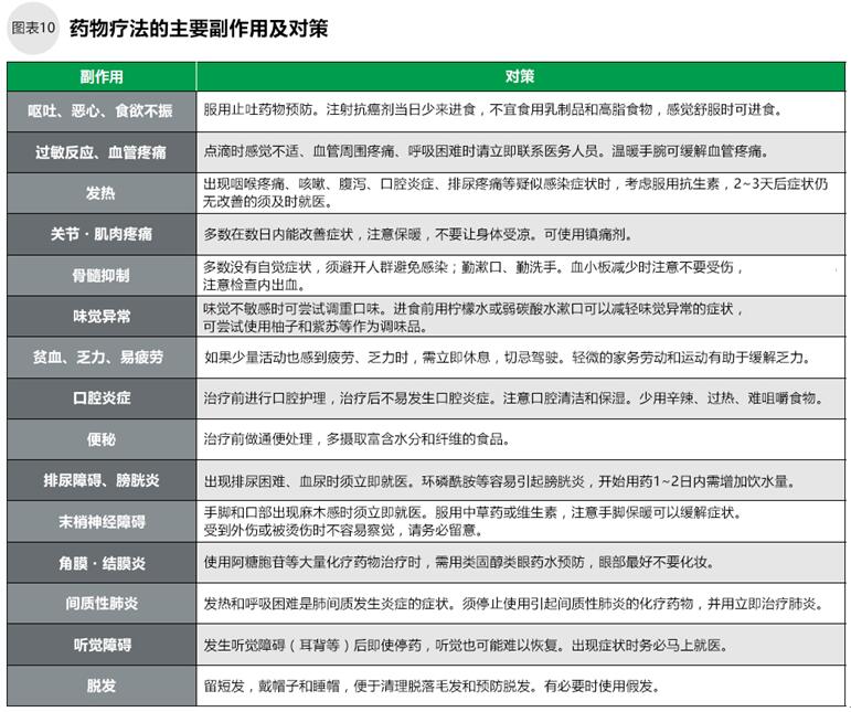 自己能感覺到的癥狀叫“自覺癥狀”或“主觀癥狀”。化療后出現的嘔吐、惡心、發熱、腹瀉、便秘等即為自覺癥狀。肝功能損傷、骨髓抑制(紅細胞、白細胞、血小板、中性粒細胞減少)等自己很難感覺到,需要到醫院檢查后才能知道。化療后出現副作用的癥狀、強度、時間與藥物的種類、用藥方法、個體差異有關。請在化療前了解其副作用(圖8~10)。