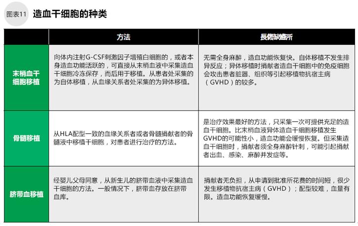 可用于造血干細胞移植治療的細胞來源有三種:末梢血液、骨髓、臍帶血(如圖11)。當尋找非血緣關系捐獻者時比較困難時,可使用自體末梢血液進行造血干細胞移植。