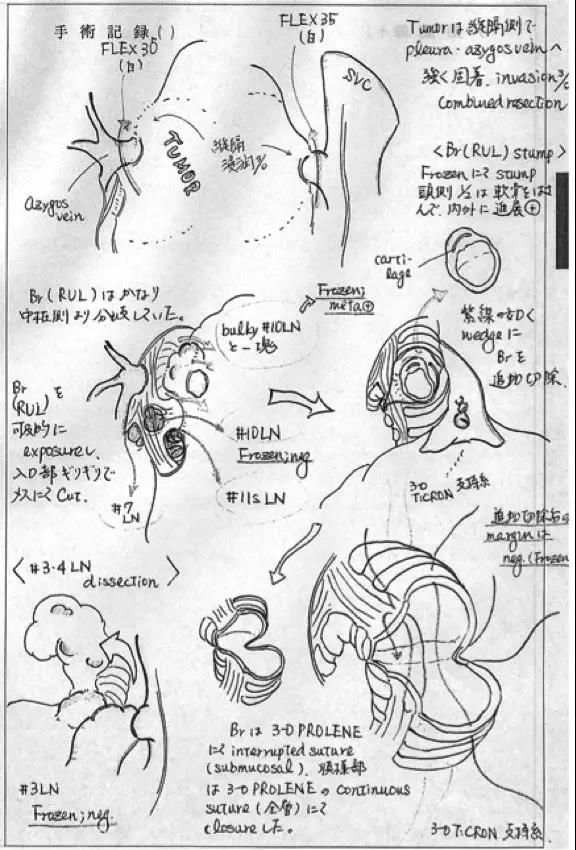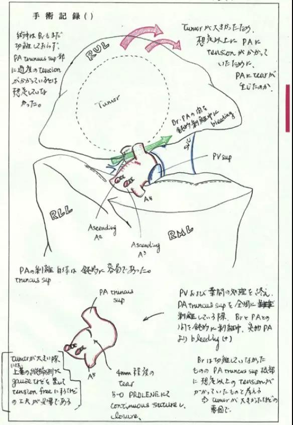 肺部的血管受到微小的損傷就會產生大出血。極其突然的事態,使我大腦一片空白,那一瞬間呆滯在了手術臺前。數十年后的今天,那次手術的場面依然深深地刻在我的腦海里。(那位患者雖然大出血,但得以及時控制并手術成功)手術結束后,我首先就拿筆將手術記錄描繪下來。我沒有跳過這次的出血事故,因為需要記錄出血原因,對策以及自己的想法,作為今后的反省。