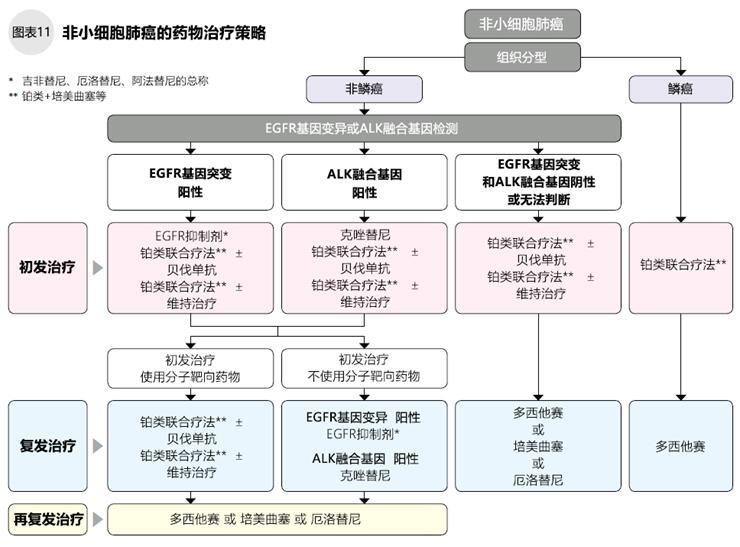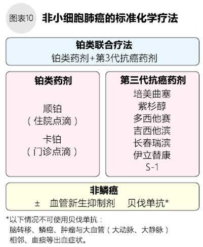 癌癥的藥物療法包括細胞毒性抗癌劑和分子靶向藥物治療,結合手術和放療、免疫治療可能預防癌癥的復發轉移。非小細胞肺癌的藥物治療有使用細胞毒性抗癌劑阻止癌細胞增殖、破壞癌細胞的化學療法,以及將腫瘤增殖的相關物質作為靶點的分子靶向藥物治療。使用鉑類制劑(順鉑、卡鉑、奈達鉑等)和第3代抗癌劑(培美曲塞、紫杉醇、多西他賽)的聯用是標準的化療方案,根據病患的整個身體狀態,在標準化療方案基礎上增加貝伐單抗也是較普遍的藥物治療方法(圖10)。