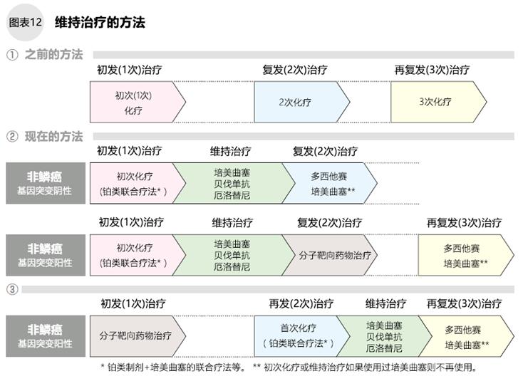 過去對于非小細胞肺癌的首次化療,在4~6次的化療后就不再進行治療了,之后隨訪觀察直到發現復發轉移后再開始治療。但是現在,經首次化療控制住腫瘤的,首次化療的療程結束后就就開始維持治療(圖12)。進而,非小細胞肺癌中,非鱗癌且基因突變陽性的患者,初期已經使用了分子靶向藥物,復發后開始使用抗癌劑,之后可一致使用低劑量抗癌劑維持治療。