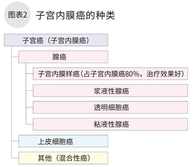 子宮癌有很多種類(圖2)。約80%以上為發生于腺細胞(分泌潤滑子宮內膜的粘液)的子宮內膜腺癌。根據是否與雌激素的分泌相關,可分多種種類(圖3)。