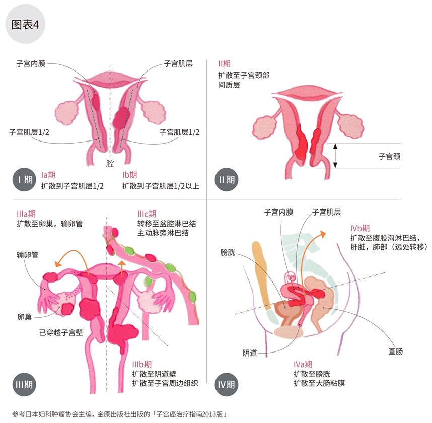子宮癌的手術切除范圍根據臨床分期決定。分期不同,切除范圍不同。