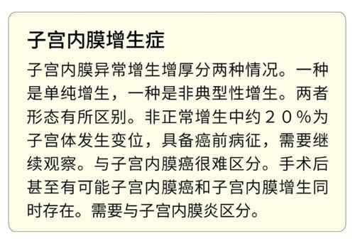 子宮內膜異常增生增厚,分兩種情況。一種是單純增生,一種是非典型性增生。兩者形態有所區別。非正常增生中約20%為子宮體發生異位,具備癌前病征,需要繼續觀察,與子宮內膜癌很難區分。手術后甚至可以發現子宮內膜癌和子宮內膜增生同時存在。也需要與子宮內膜炎區分。
