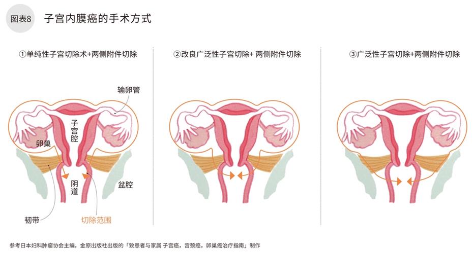尚可不必實施“廣泛性子宮全切術”(將子宮韌帶及周邊組織從盆腔結合處切斷,陰道壁,陰道周邊組織切除)。(圖表8-2)。可行“全子宮切除術”和“廣泛性子宮全切術”中間的“次廣泛子宮切除術”。