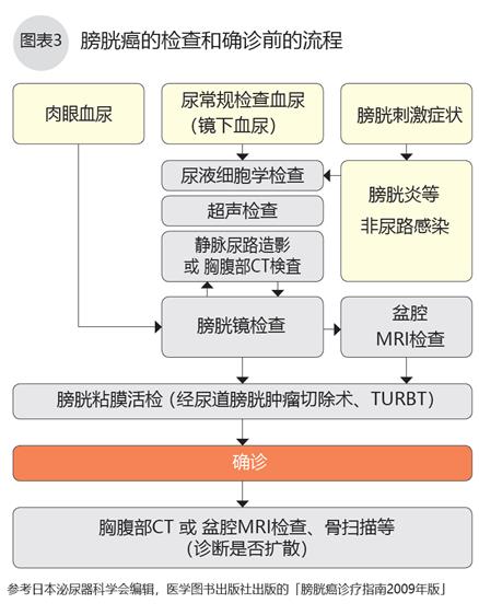 要確診膀胱癌,需要進行病理診斷。即局部(下半身)麻醉,通過內視鏡切除部分膀胱病變的粘膜進行活檢。通常早期膀胱癌的治療方法為經尿路膀胱腫瘤切除術。如果是淺表性癌,或尿路上皮癌,通過膀胱粘膜活檢即可進行治療(圖表3)。浸潤性癌則需要進一步進行胸腹部CT檢查,骨掃描等確認淋巴或其他器官是否發生轉移。通常,經過胸腹部CT檢查后才實施膀胱粘活檢。
