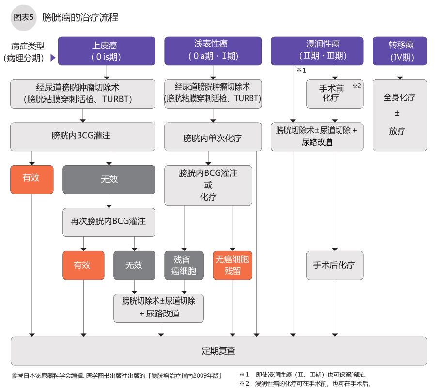 治療流程按請參照圖表5。淺表性癌或上皮癌,首先通過內視鏡治療(叫做經尿路膀胱腫癌切除術,兼活檢),將病灶切除,之后為預防復發實施藥物療法。藥物療法的藥物種類和治療頻度,根據腫瘤的類型,惡性程度,及數量大小等各不相同。