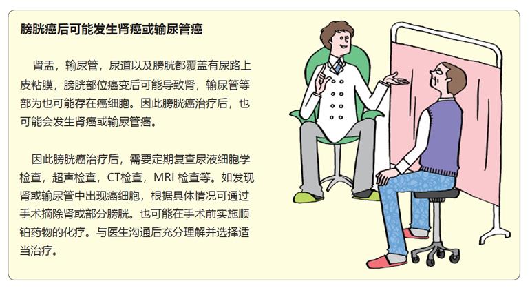 復發,指治療后再次出現癌組織。TURBT術時在膀胱內,膀胱全切術時在腎盂或輸尿管中已經發生轉移了。轉移,指癌細胞擴散到淋巴或膀胱周圍其他器官,再次形成腫瘤。