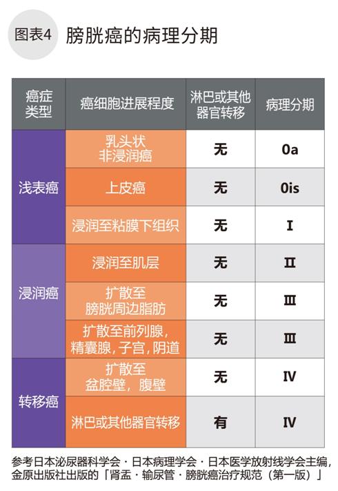 病理分期是根據腫瘤進展程度確定治療方法的標準。膀胱癌的病理分期根據腫瘤的性狀,在膀胱中的擴散程度,是否轉移淋巴或其他器官等分為Oa期,Ois期,Ⅰ期、Ⅱ期、Ⅲ期、Ⅳ期六個階段(圖表4)。數字越大進展程度越廣泛。Oa期和Ⅰ期為癌細胞尚未浸潤肌層的淺表性癌。Ois期是上皮癌。Ⅱ期和Ⅲ期的癌細胞已經浸潤肌層的浸潤性癌。Ⅳ期則是癌細胞已經侵襲盆腔壁,腹壁,或已經擴散到淋巴及其他器官的轉移癌。癌細胞的進展程度和惡性程度,可通過膀胱黏膜活檢來判斷。