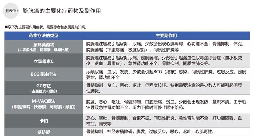 BCG灌注療法需要注意可能會出現膀胱炎和排尿障礙?;熕幬锏闹饕弊饔猛ǔT诮o藥后隨即出現惡心,過敏;一周后可能出現骨髓抑制,口腔潰瘍;兩周后可能出現脫發,腎功能障礙等。