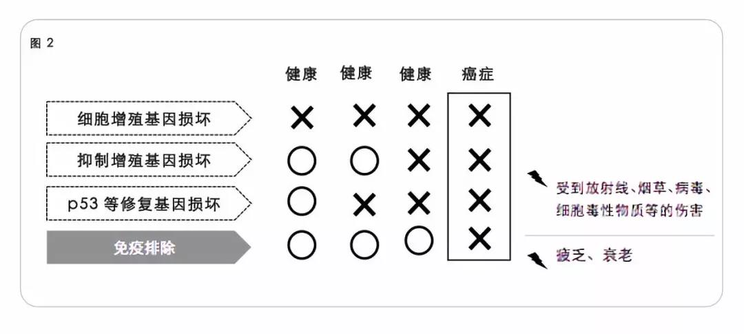 人類的基因中,存在一類修復錯誤基因的DNA,他們在發(fā)現(xiàn)基因異常時本來可以發(fā)揮作用,清除或修復原癌基因、癌基因。但是,在某種原因下修復基因出錯,同時癌變細胞沒有被免疫清除,就會發(fā)生癌癥(圖2)。