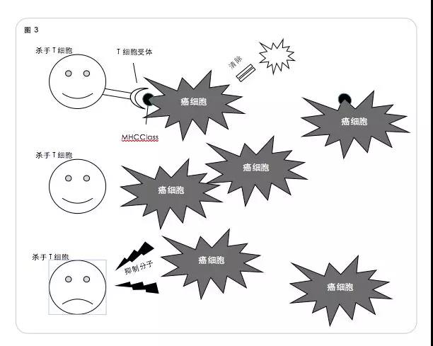 狡猾的癌細胞會模仿胚胎細胞的生存方法,一樣可以躲避免疫攻擊。癌細胞制造的蛋白質(zhì)和病毒一樣,具有與正常自體細胞不同的面孔(癌抗原),當這個面孔在癌細胞表面時,免疫細胞就會識別它,對癌細胞發(fā)起攻擊。但是癌細胞為了自身的生存,將特殊的面孔隱藏在細胞膜內(nèi),就可以躲避免疫監(jiān)視;有的癌細胞會釋放干擾免疫細胞正常工作的物質(zhì),也能躲避免疫細胞的攻擊(圖3)。