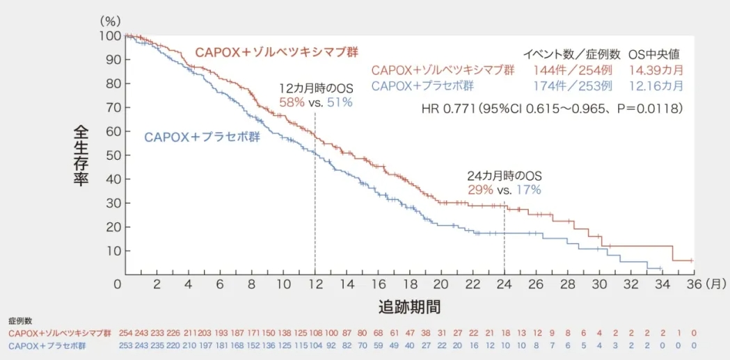 是一項III期臨床試驗,旨在檢查在卡培他濱+奧沙利鉑(CAPOX)治療基礎上添加佐妥昔單抗的效果。與SPOTLIGHT研究類似,CLDN18.2陽性被定義為腫瘤細胞75%+,CLDN18.2中度至強表達。在對507名患者的研究中,CAPOX+佐妥昔單抗組的中位PFS顯著優于CAPOX加安慰劑組的6.80個月,為8.21個月。( HR=0.687,95 % CI 0.544~0.866,P = 0.0007)。中位總生存期OS在CAPOX +佐妥昔單抗組為14.39個月,而安慰劑組則只有12.61個月。(HR= 0.771、95 % CI 0.615~0.965,P = 0.0118,圖2)。兩組間不良事件發生率無顯著差異。