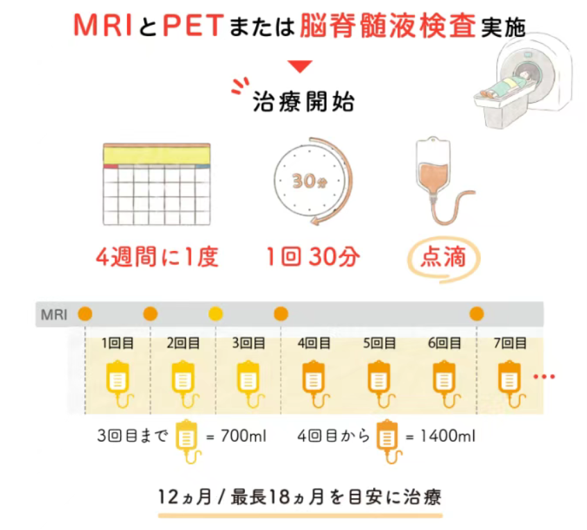 每四周進(jìn)行一次,每次輸液30分鐘。預(yù)計治療周期為12個月,最長可達(dá)18個月。
